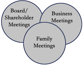A good family meeting differs from a business meeting or board/shareholder meeting in several key ways. The board and shareholder meetings tend to focus on mission and fulfillment of quantified objectives. Business meetings tend to focus on executing directives from the board. Family meetings are unique in because they: